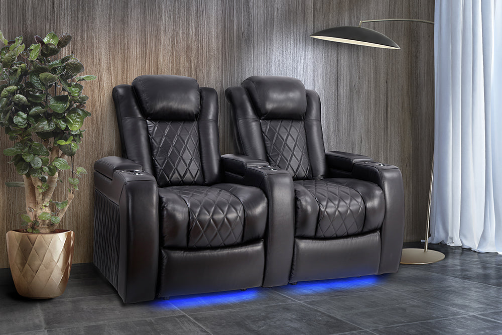 A compact version of our Bestselling Tuscany home theater seat, the Tuscany Slim is equipped with premium features and allows you to conserve space with its 34” width frame. Italian top grain Nappa leather 11000 on all seating surfaces, motorized recline, lumbar & headrest, among other highly desired features will have you spending your movie nights on cloud 9.