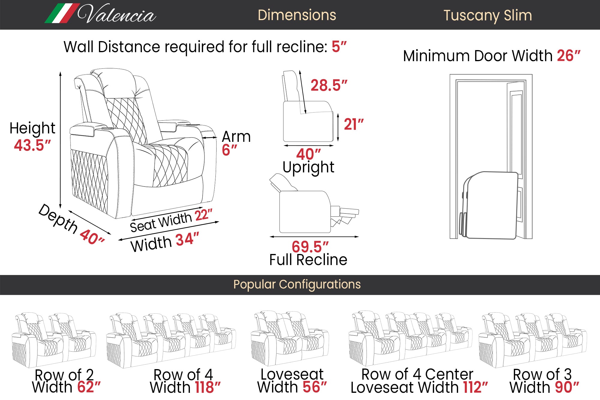 - Space-saving 34” frame design that delivers premium comfort while fitting into compact home theaters.