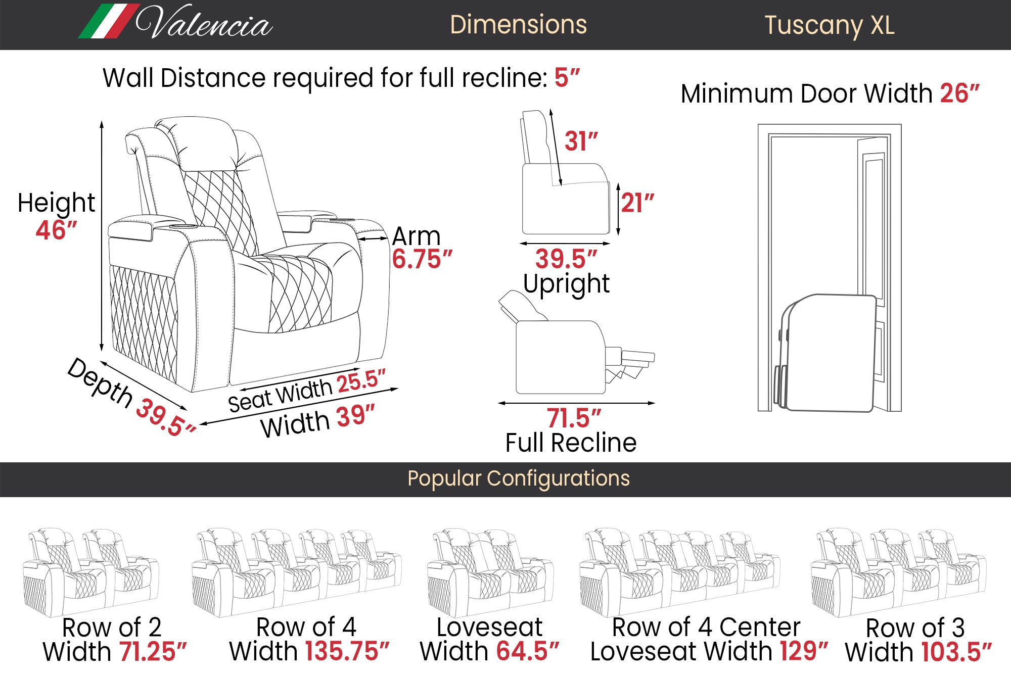 More space for more happiness. At Valencia Theater Seating, we want everyone to enjoy their movie night which why we developed our Tuscany XL series. This epic-sized chair is an upgraded version of Tuscany. It kept all the best features of the standard Tuscany but increased the seating space and weight capacity. If you are someone who wants more seating space, the Tuscany XL will take your movie experience to the next level.