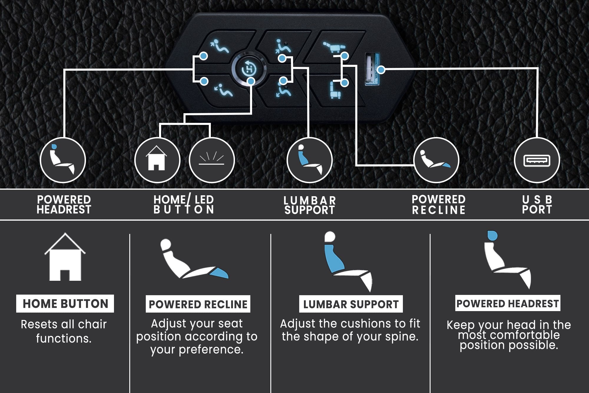 - Motorized Lumbar Support: Adjustable lumbar support contours to your spine for personalized ergonomic comfort.
