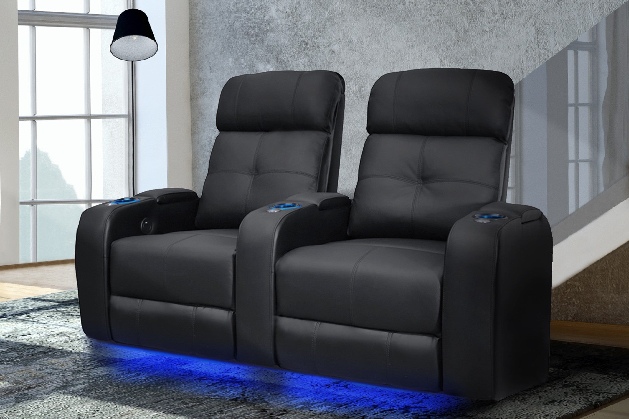The Verona's elegance offers a truly unique home theatre experience for every occasion. With LED cup-holders, ambient base lighting, premium Italian Nappa 9,000 Top Grain Leather on all sitting surfaces, a USB outlet, and motorized recliner mechanisms, the Verona will create a memorable home theatre experience every time!