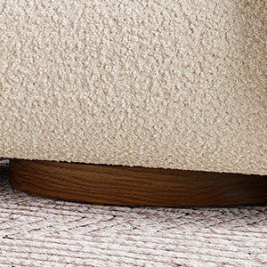 Introducing the Violet chair, a sophisticated and contemporary twist on the classic barrel chair design. This piece is a symphony of comforting curves, blending a timeless aesthetic with modern flair. The Violet chair boasts a rounded silhouette, emphasized by padded channeling that seamlessly flows from the arms, across the back, and down to the base, completing a full loop of elegant continuity. Crafted in a luxurious light beige textured boucle, this chair offers a plush, tight-cushioned seat coupled with a low-profile, enveloping backrest. It rests on a discreetly recessed base, revealing just a hint of wood grain finished in a delicate brown, adding a touch of organic warmth to its appearance.
