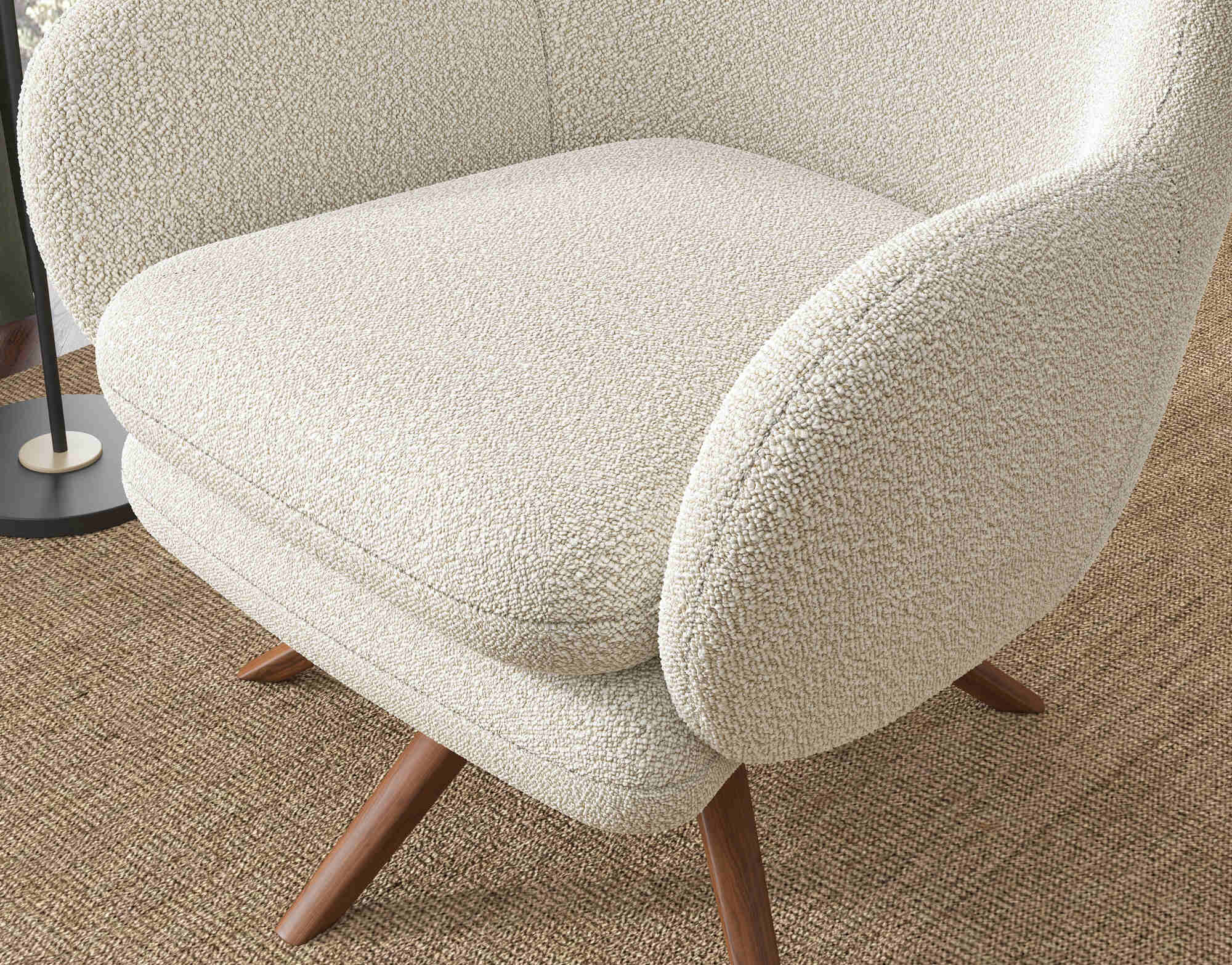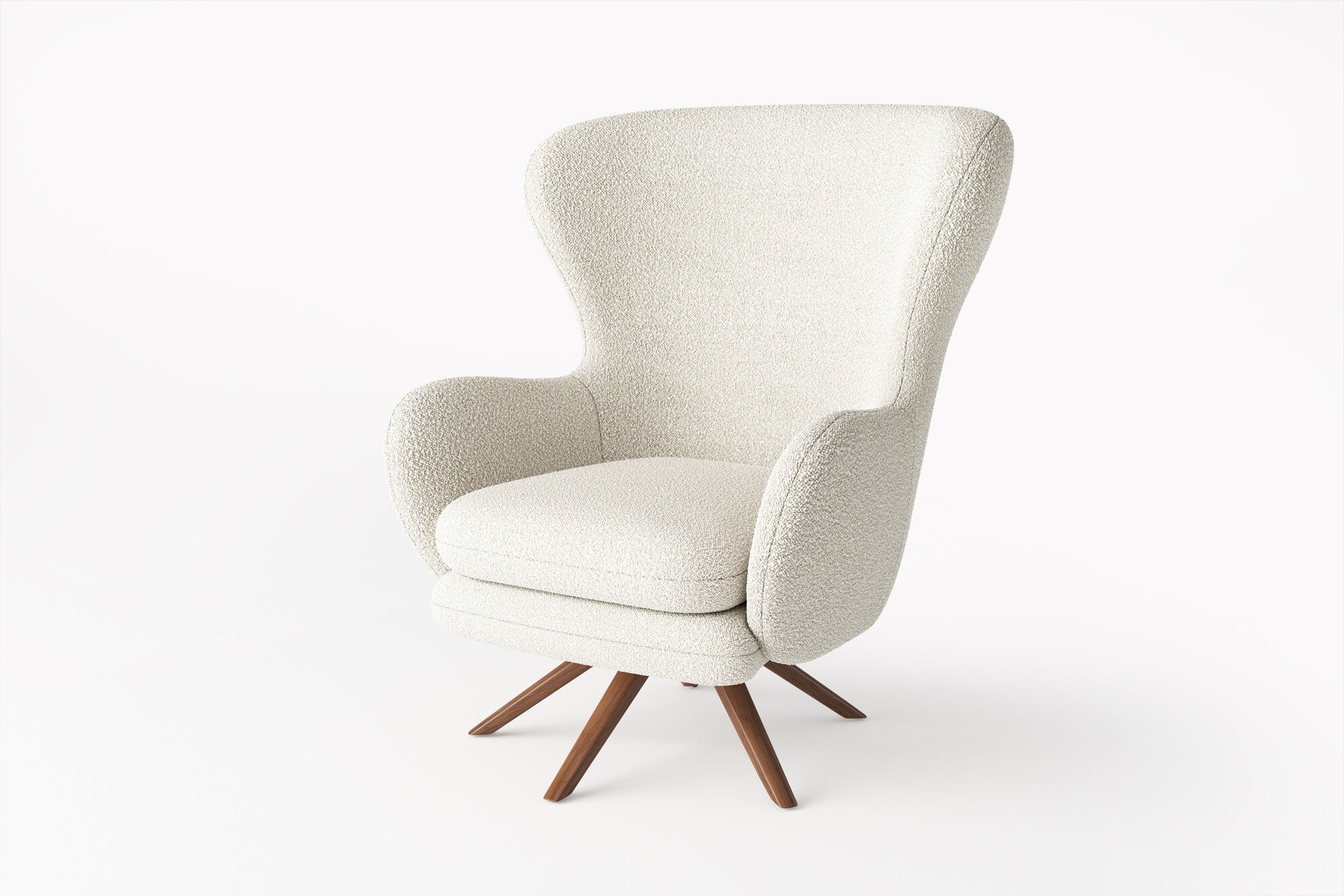 Introducing the Winston Accent Chair - a seamless fusion of Danish design and mid-century flair. Crafted with kiln-dried hardwood, its durable frame perfectly complements the plush upholstery, exuding elegance. Experience unparalleled comfort with a 360° Swivel Mechanism and plush high-resiliency seat cushions, wrapped in a feather-down blend. The solid walnut legs, finished in a warm tone, add a touch of sophistication. Elevate any space with expressive lines, an exaggerated wingback, and rounded armrests, redefining classic charm with modern allure. Indulge in both style and comfort - bring home the Winston chair today!