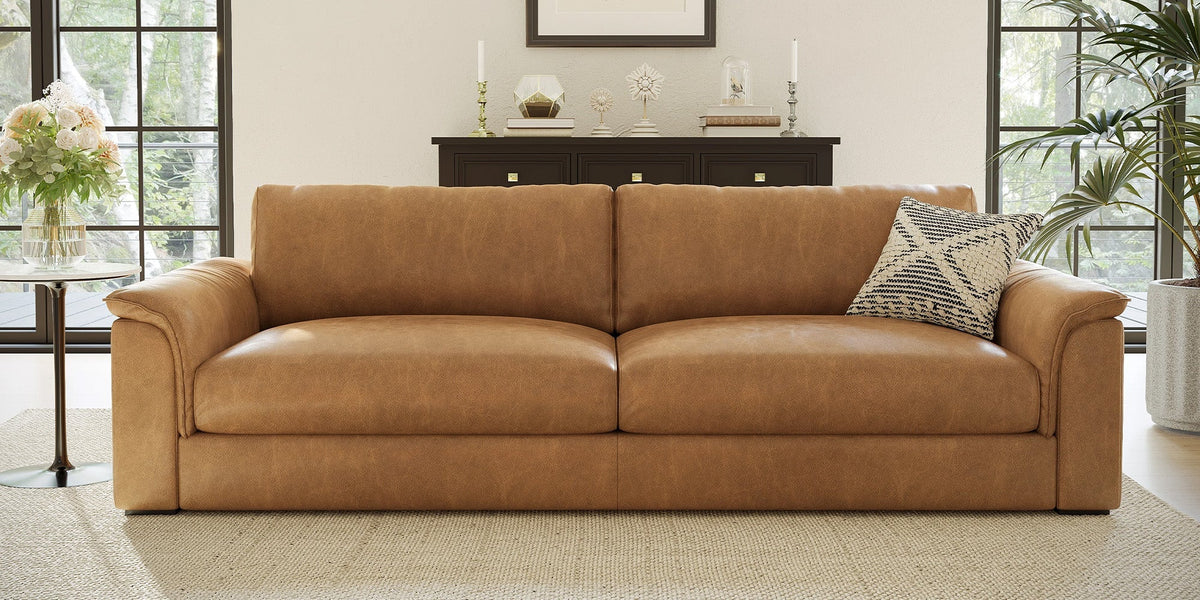 - Exquisite topstitching and French-seam tailoring lend our leather couch a refined and stylish finish, elevating its aesthetic appeal.